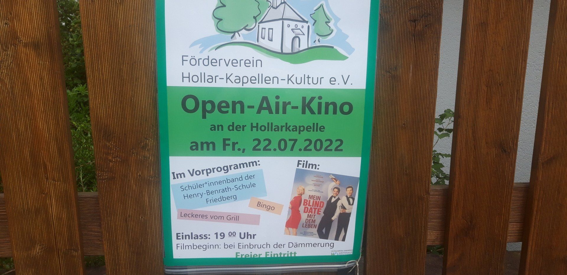 Der Abend begann um 19.00 Uhr mit einem gut 1- stündigen Konzert der Schülerband mit einer Sängerin der Henry-Benrath-Schule. Die Zuhörer waren begeistert und es gesellten sich immer mehr Gäste von nah und fern dazu. Die Gäste stärkten sich mit gegrillten Würstchen oder Kartoffeln mit Kräuterdip und kühlen Getränken, bis es dann so gegen 21.00 Uhr mit dem allseits beliebten Bingo-Spiel weiterging. Mit Einbruch der Dunkelheit begann der eigentliche Kino-Abend. Die Verantwortlichen wollten nach 2 Episoden mit“ Don-Camillo und Peppone“ einen moderneren Film zeigen und entschieden sich für „Mein Blind Date mit dem Leben“. Der Film wurde durchweg gut von den Besuchern angenommen und regte zum Nachdenken an. Für den Vorstand begann aber danach noch die Aufräumaktion, was am nächsten Morgen bei Tageslicht dann nochmal weiterging. Aber der gelungene Abend und die positive Resonanz machten es allen Beteiligten leichter und so freuen wir uns schon auf die nächste Veranstaltung in unserem „Amphitheater“ an der Hollarkapelle.